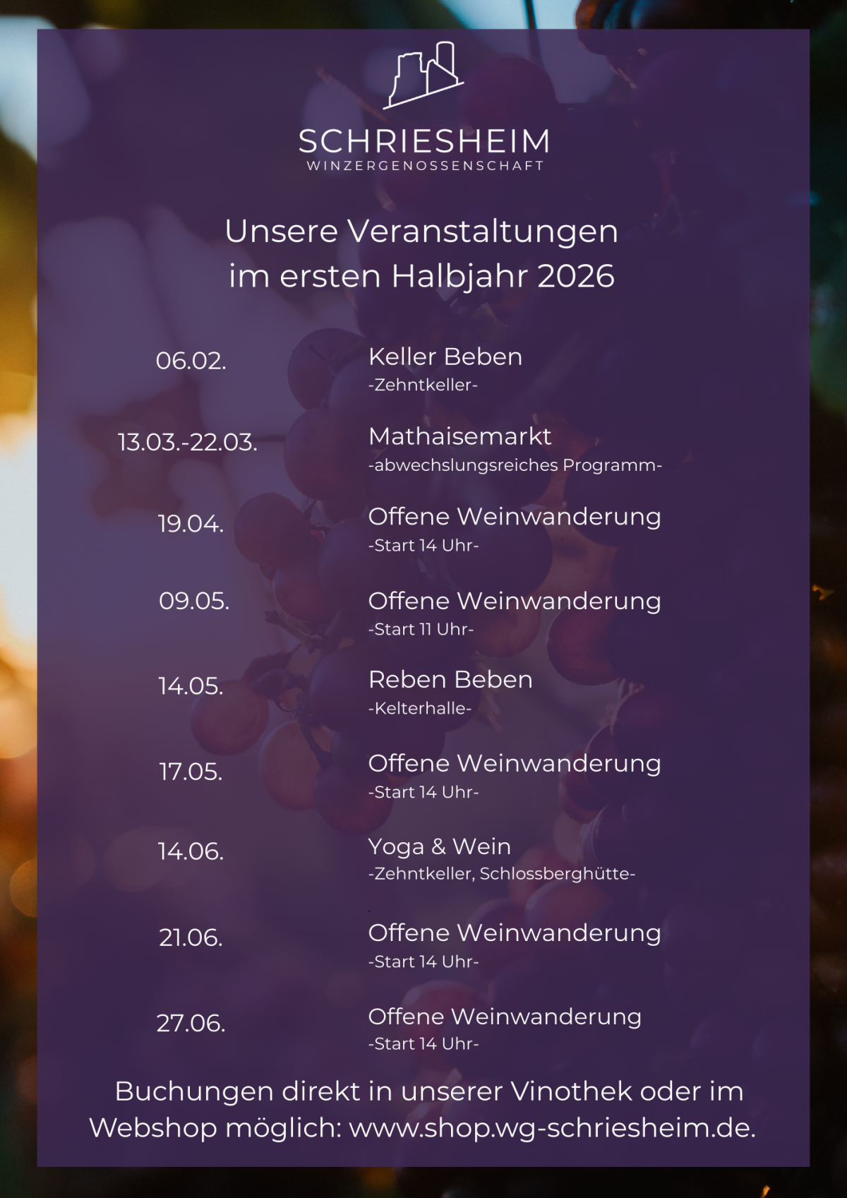 Im Herzen der Badischen Bergstraße bewirtschaften wir, die Schriesheimer Winzerinnen und Winzer, unsere Weinberge mit Hingabe, Respekt vor der Natur und auch mit ein wenig Stolz. Uns verbinden Genuss und Lebensfreude.